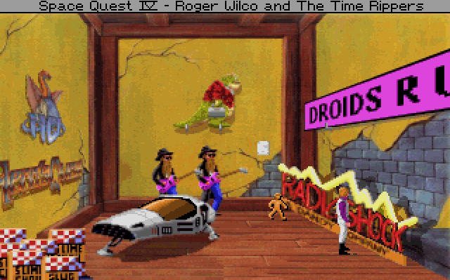 - The Droids R Us sign from the original AGI version of Space Quest 1. Later versions of the game had the name changed to Droids B Us due to liability issues of the name's similarities to the toy store chain Toys R Us. Ironically, Space Quest VGA has Droids B Us more resemble Toys R Us.